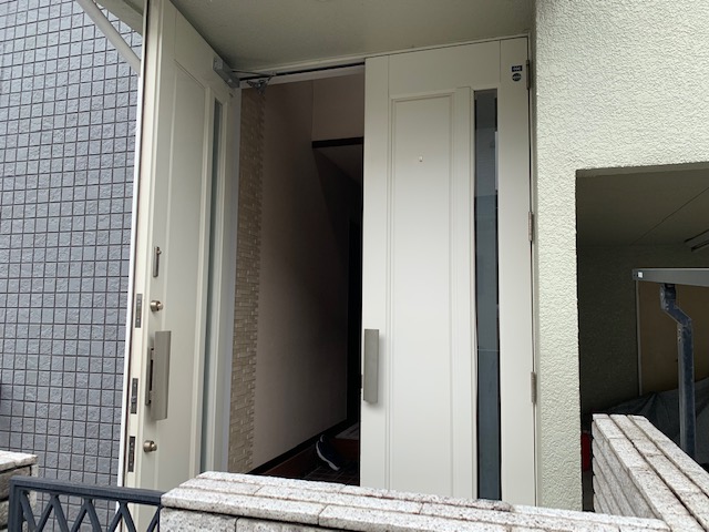 完成です。 既存のドアから比べてガラッと印象を変えることなく、既存の外壁などと調和しており素敵です。