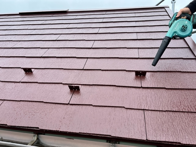 先ほどまで霧雨が降っており、雨が止んだタイミングで屋根に残る水滴をブロアーで飛ばしていきます。