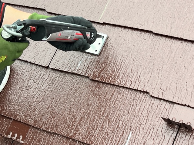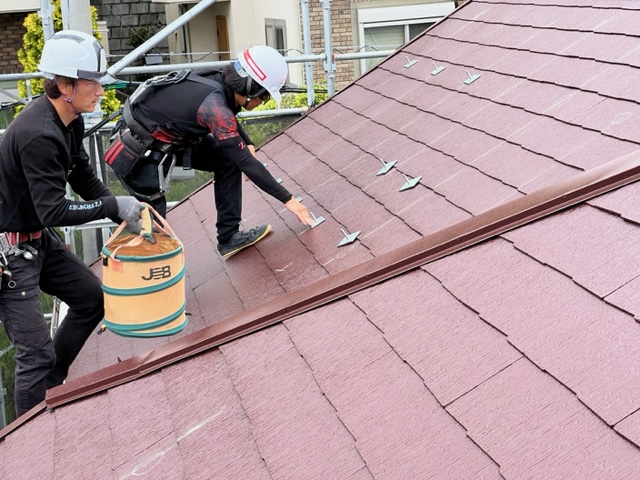 太陽光の工事の工程は架台を設置する為の支持金具の取付→架台設置→電気の配線工事→パネル設置となります。 先ずは支持金具を屋根に設置していきます。