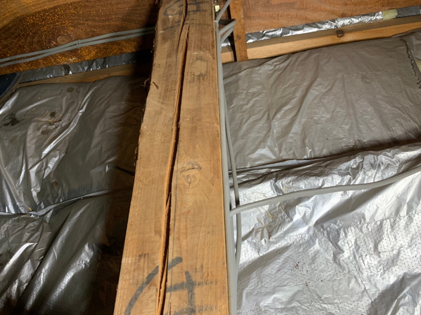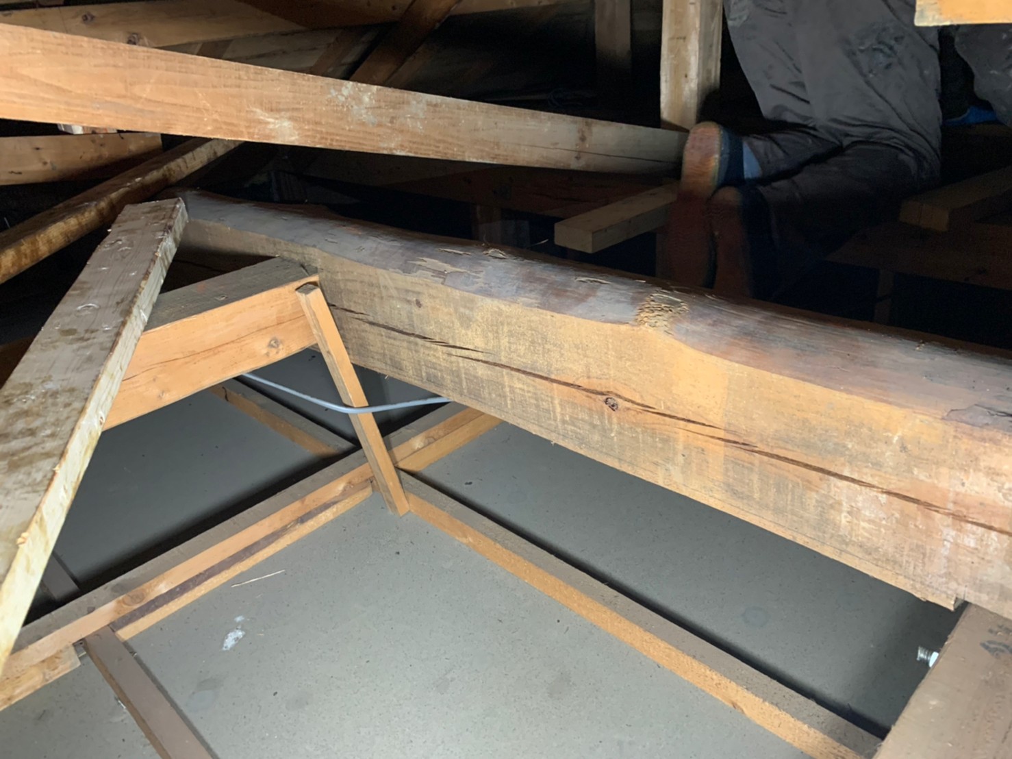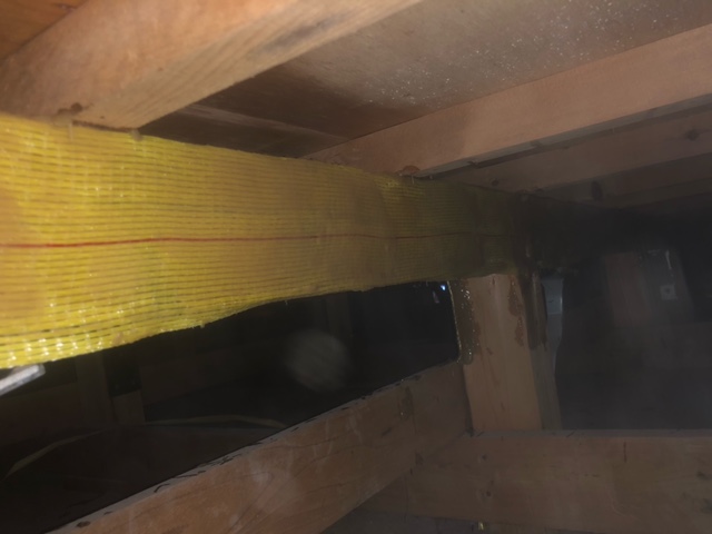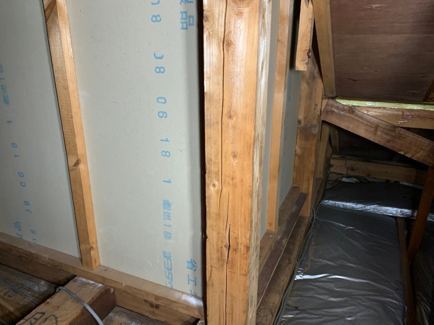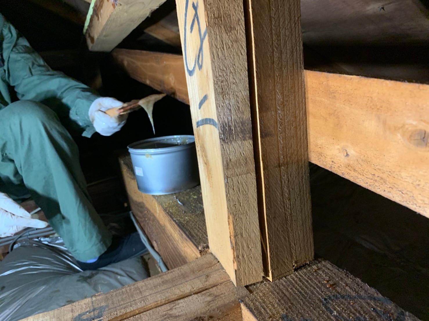 今回は小屋裏の木部に干割れが多数あったので、タフロンウッドP・アラミド繊維を使用して木部の補強工事を行いました。
