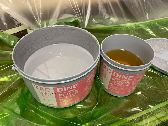 写真にあるピンク色のラベルのものが、プライマーになります。これを先ず基礎に塗布していきます。