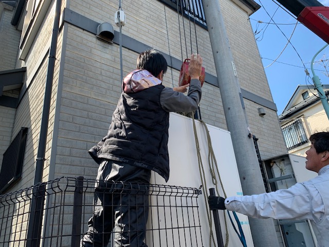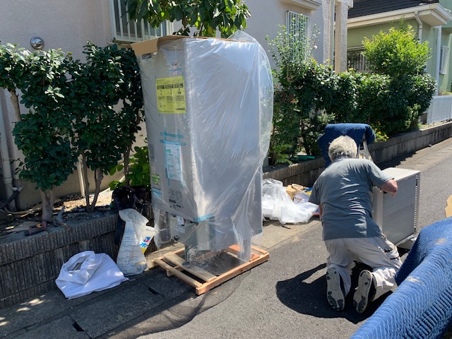 ご覧のような狭小スペースに設置されており、かつ、電気のメーターや雨樋などが壁面に設置されているために、そのまま搬出するというわけにもいかずに、ブロック塀の上からの搬出、搬入となりました。