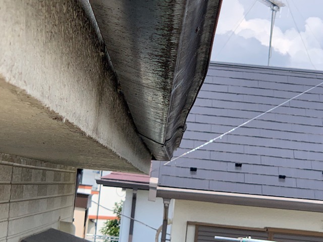 四方向全て下から確認したところ、三方向は雨漏れしておりました。 梯子をかけてみると、雨樋がかなりひっしゃげっており、勾配も取れていないせいか、かなり水が溜まっておりました。