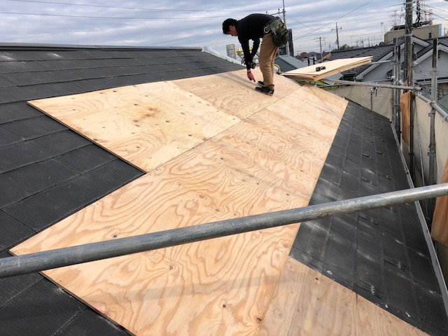 既存の屋根の上に下地材を張り込み、ルーフィングを貼ってガルバニウム材の屋根を被せていく工程の初日は下地材の張り込み工事です。