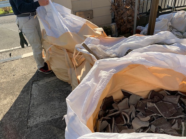 下ろした瓦は砕いてフレコンパックに詰め込み、ユニックで引き上げてもらいます。