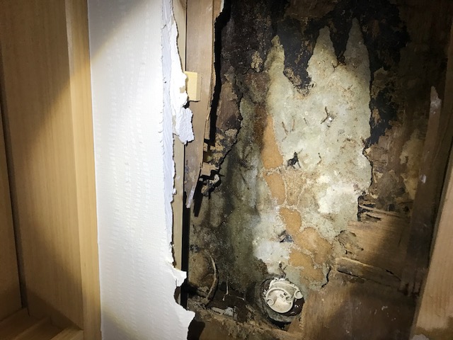 「クロスに紫色の染みができてる」と…おそらくはカビであることから雨漏れの懸念もあったので、早速室内の壁を解体してみると、やはり雨漏れの跡がありました。だいぶ長いこと続いているような感じでした。