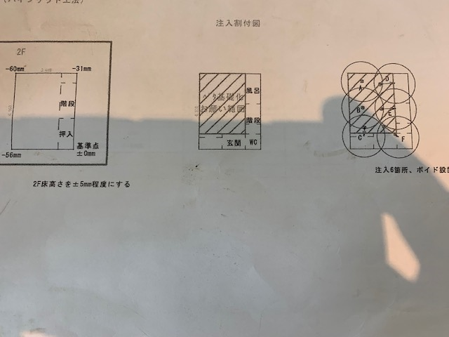 家の傾きを直す方法としては、ジャッキで家ごと持ち上げるという方法ではなく、セメント系薬液を数カ所注入して、その量配分を各箇所で計算して家の傾きを直していく工法をとられるようです。