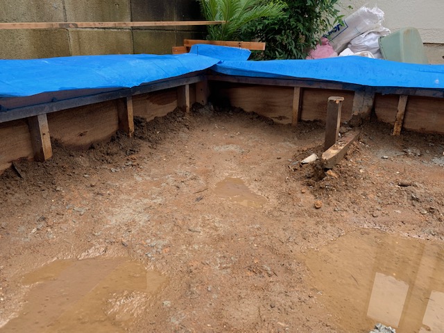 物置き設置する為に、前回まで基礎の鉄筋を組んだところまでアップしましたが、その後はご覧のように型枠を組んでそこにコンクリートを流し込みます。