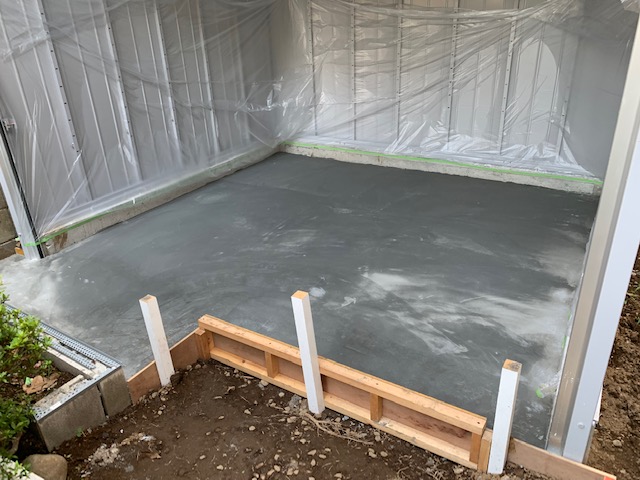 さいたま市の物置設置工事の現場です。前回物置き内のコンクリート打ちが無事完了しましたので、本日は仕上げ工事でお伺いしました。